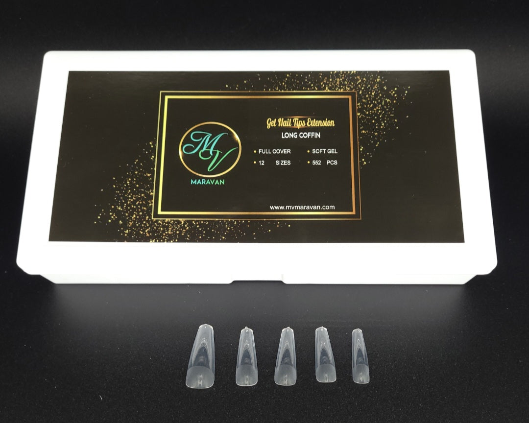Maravan's Long Coffin Gel Nail Tips Extension is made from soft gel, a material that can be melted off by acetone resulting a healthier choice for the natural nails. Our nail tips are lightweight and flexible, but also stronger on the end of the tips lasting up to 4 weeks of extension wear.
